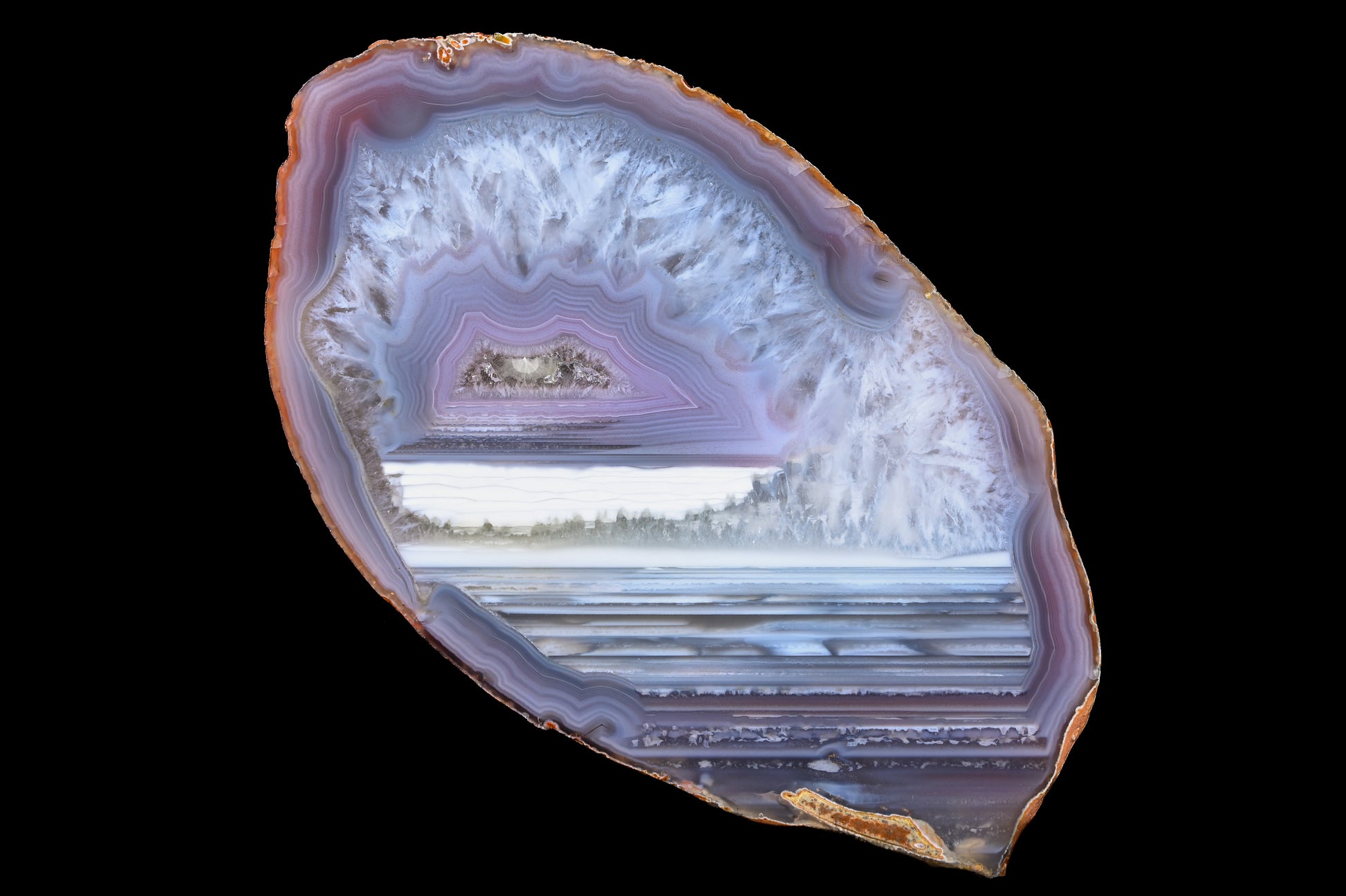 Die Achate sind schön gebändert und oft mit starken Kontrasten. Die dominanten Farben sind Rot, Blau und Weiß, auch mit Abstufungen in Rosa und Lila. Manche der Stücke haben Wegeler, und viele der Stücke haben einen ähnlich starken Kontrast in der Bänderung wie die Achate aus Botswana, nur dass hier auch noch oft Rot-Töne in Kombination vorkommen. Außerdem gibt es einige Stücke mit nadeligen Pseudomorphosen, Augen und viele Stücke mit Lagen-Bänderung.