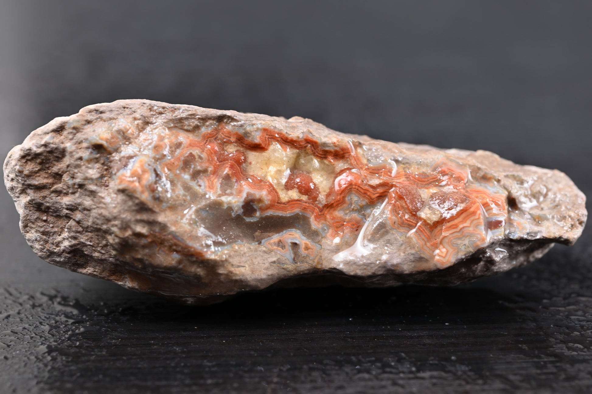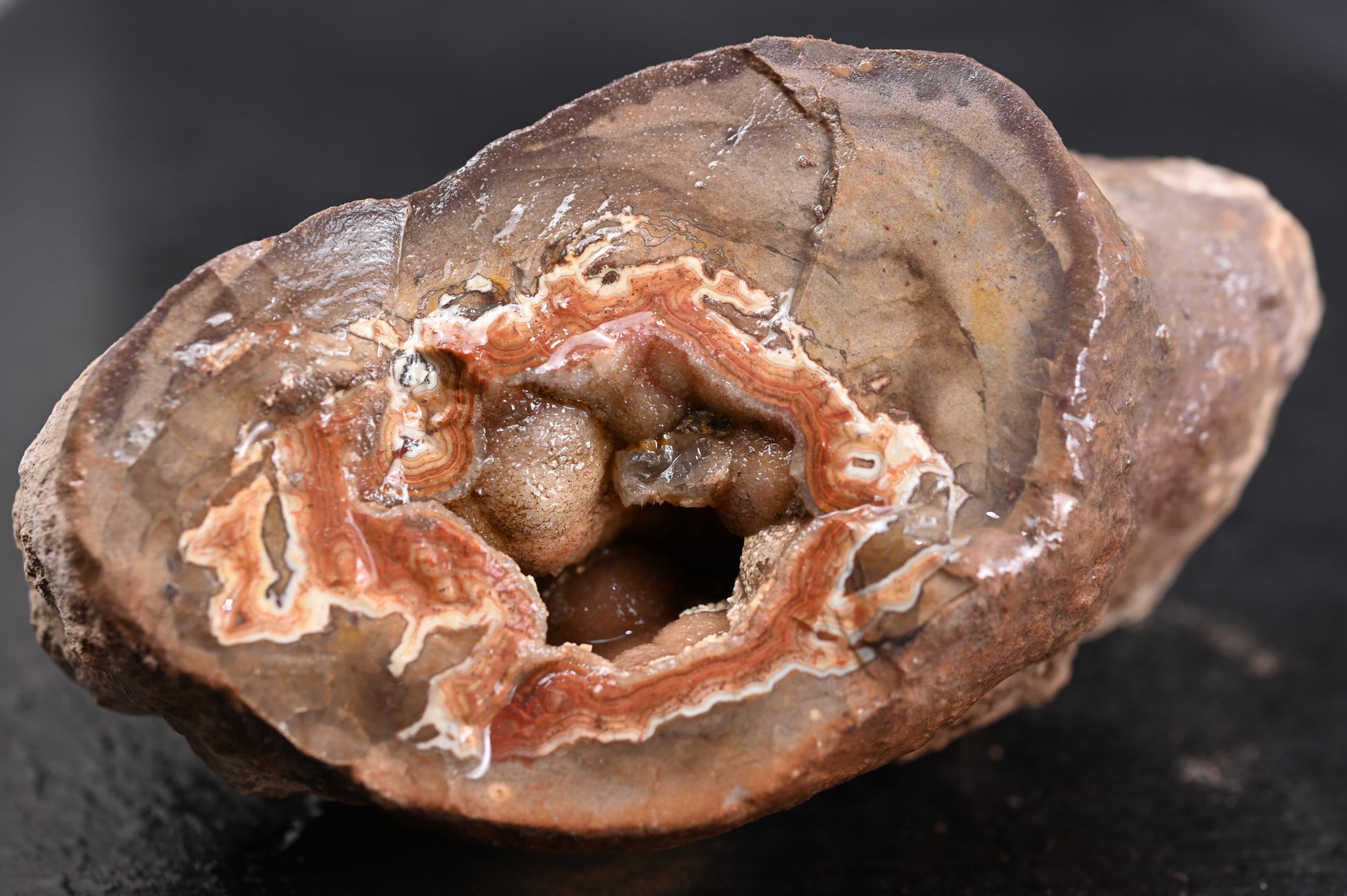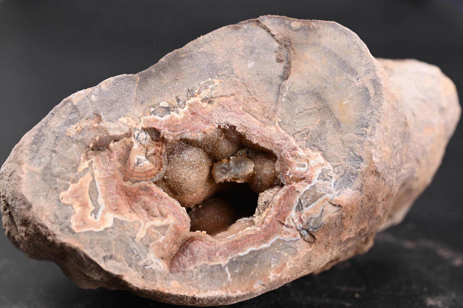 Sie sind sedimentär gebildet, und die Achatzentren befinden sich oft in kleineren "Pockets", nicht unbedingt immer im Zentrum der Kugel. Das heißt, Nachschneiden lohnt sich manchmal bei diesen Stücken, da der größte Achat-Anteil sich oftmals nicht in der Mitte der Kugel befindet. Die Stücke sind vorselektiert, daher ist das Potenzial dieser Stücke sehr viel höher als bei "regulärem" Material von diesem Fundort.